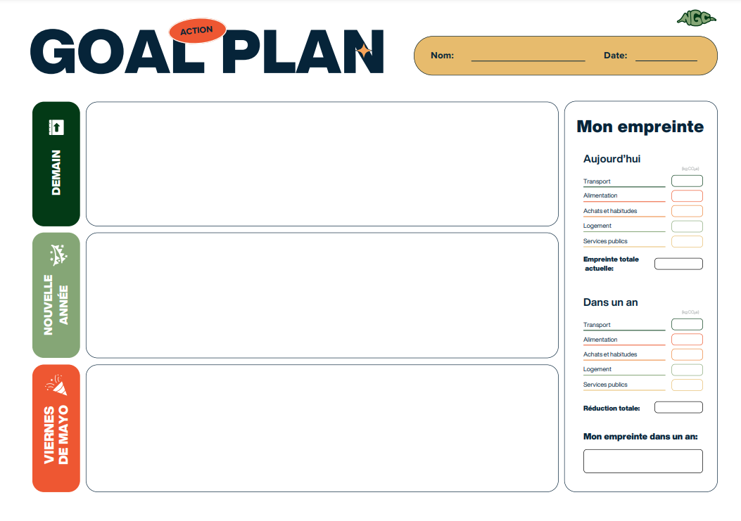 - Session 3 - Plan d'action : À partir des résultats obtenus grâce au calculateur, une activité dynamique est organisée pour identifier les actions qui contribuent le plus à augmenter l'empreinte carbone et celles qu'il est possible de modifier ou d'adopter au quotidien pour la réduire. Cette session se termine par la création d’un plan d'action que les participants pourront appliquer dans leur vie quotidienne.